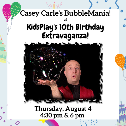 Casey Carle’s BubbleMania! will take place at the Warner Studio Theatre at 4:30 pm & 6 pm.