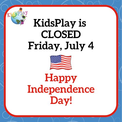 Closed July 4 Fri, Jul 04 | All Day KidsPlay will be CLOSED Friday, July 4 in observance of Independence Day and will re-open at 10 am on Saturday, July 5. Enjoy your holiday! July 1, 2025 July 4, 2025 Share EmailXFacebookGoogle +PinterestTumblrLinkedinVkontakte