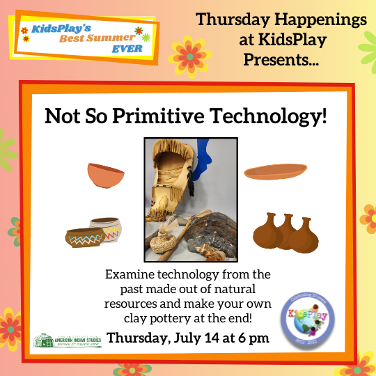 We will first examine technology from the past made from natural resources like bark baskets, gourds, and stone bowls. Children will then have the opportunity to create their own clay pottery to take home.